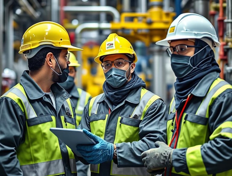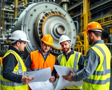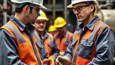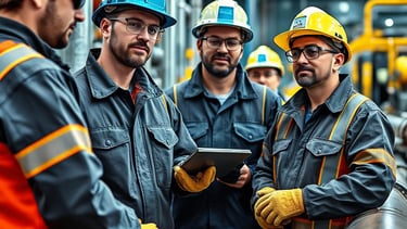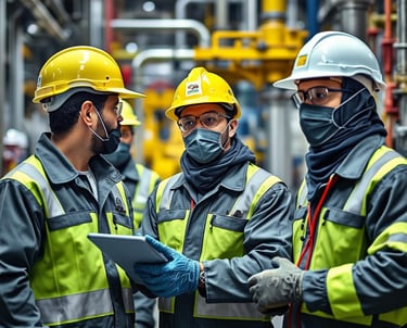 Engineers supervising complex shutdown operations in a petrochemical plant.